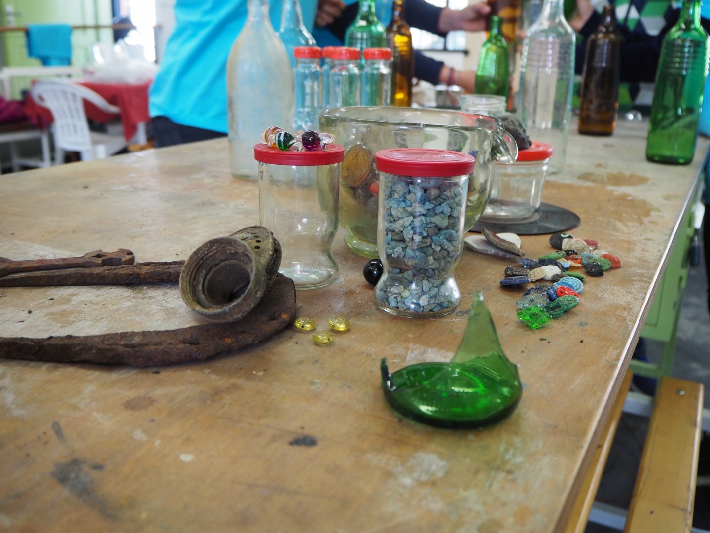 A jelikož se workshop uskutečnil ve sklářských dílnách a téměř každý tým si nějaké to sklo z řeky přivezl, stroje na jeho úpravu jely na plné obrátky. Broušení, rytí, pískování, řezání, dokonce i foukání skla si účastníci mohli vyzkoušet, a své výtvory tím doladit do detailů podle své představy.